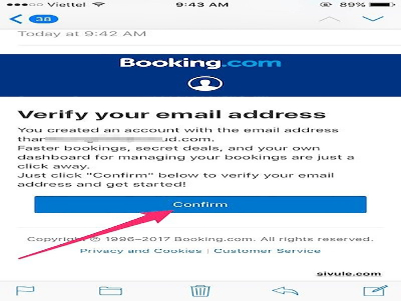 Lúc này Booking sẽ gửi cho bạn một thư kích hoạt đến tài khoản email bạn nhập ở trên. Bạn mở thư này, nhấn vào nút Confirm (hoặc Xác nhận) để kích hoạt tài khoản. Lúc này tài khoản Booking của bạn đã được kích hoạt và có thể sử dụng ngay. Chúc các bạn thành công!!!