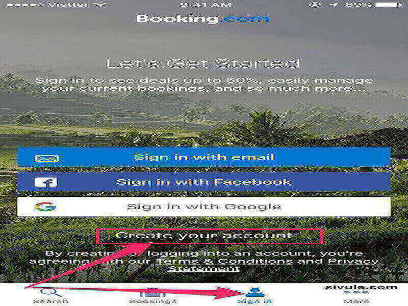 Mở ứng dụng Booking.com vừa tải về, nhấn vào tùy chọn Sign in trong menu bên dưới rồi nhấn tiếp vào nút Create your account . Tương tự như trên máy tính, bạn cũng có thể tạo nhanh tài khoản Booking.com sử dụng tài khoản Facebook và Google (Gmail) bằng cách nhấn vào các nút Sign in with Facebook hoặc Sign in with Google . Tuy nhiên mình vẫn khuyên dùng tạo tài khoản bằng email sẽ dễ dàng quản lý hơn.